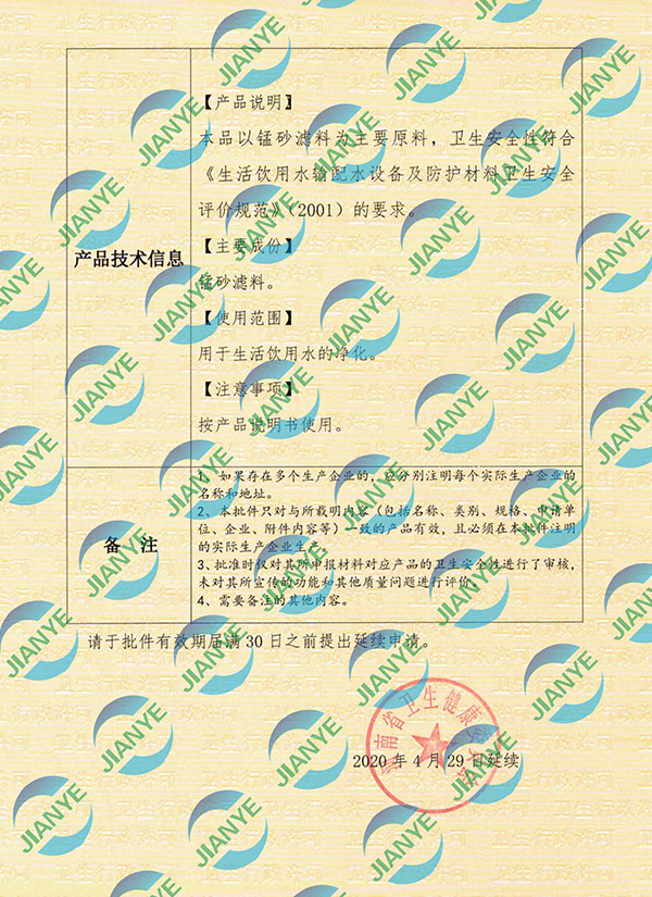 20-24錳砂衛(wèi)生批件【建業(yè)凈水】