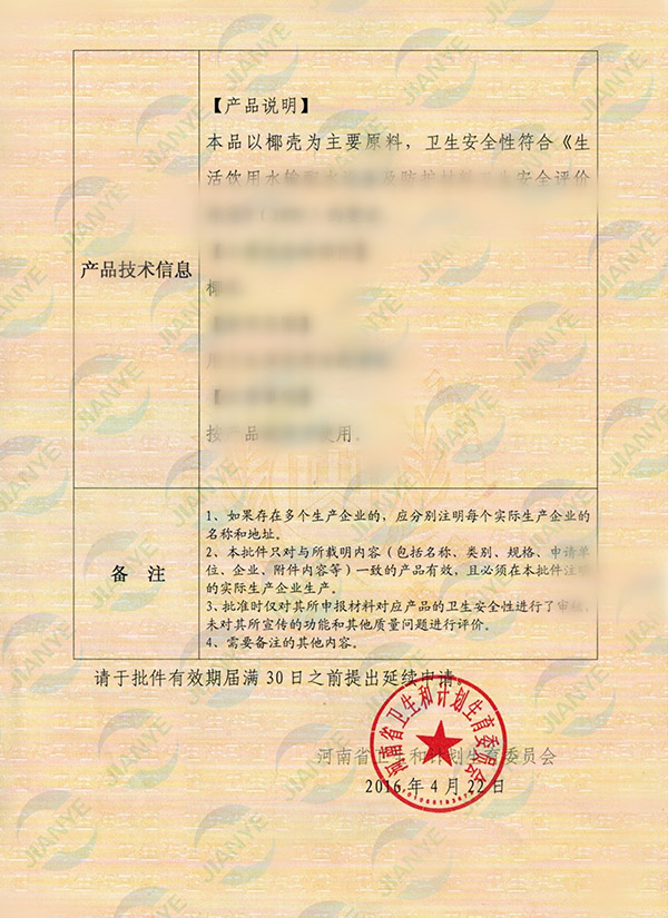16-20建業(yè)牌活性炭衛(wèi)生批件